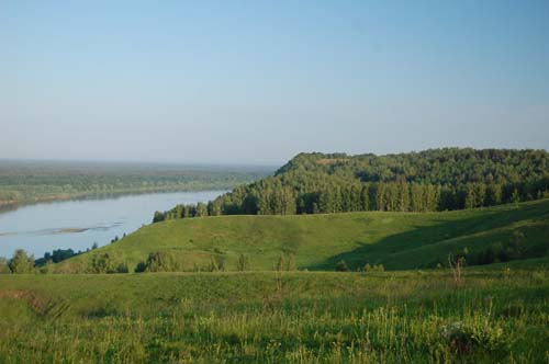 Июньские праздники 2008 г. мы решили посвятить полетам на парапланах, так что всю неделю, предшествующую выходным, изучали прогнозы погоды и выбирали между Орловской и Нижегородской областями. В конце концов мы убедились, что "более летательной" будет погода в Нижегородской области, и в ночь с 11 на 12 июня поехали под городок Горбатов. Ехали всю ночь, продираясь сквозь пробки, образованные московскими и нижегородскими дачниками, и, наконец, в пять утра оказались на месте. Утро было чудесное, ложиться спать было уже глупо, и мы пошли обозревать окрестности.