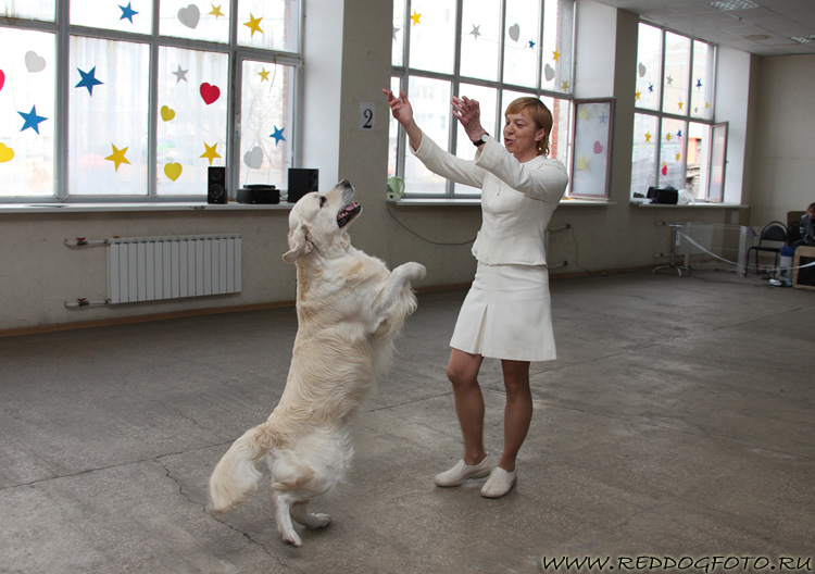 В рамках нашей выставки зрители получили удовольствия от замечательного фристайла Ольги Нечаевой и ее голдена Dewmist Kinzenze.