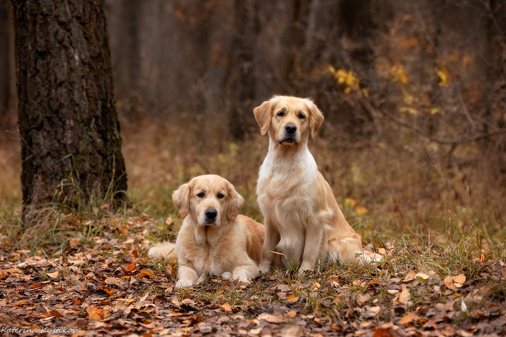 На фото изображены золотистые ретриверы Звезда Севера Янтарная Гардарика и Вива Ла Вида Ангелик Натуре