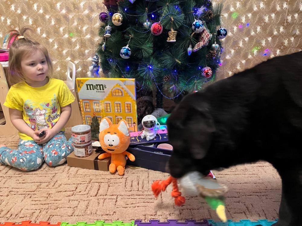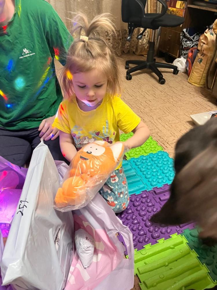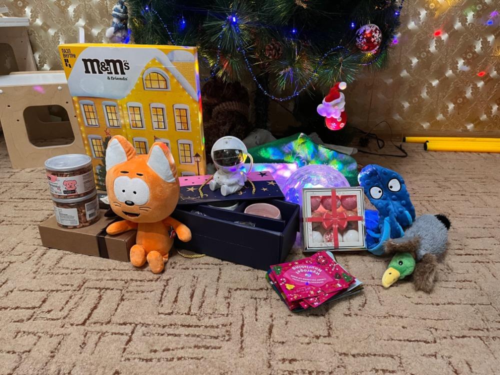 Мы с мужем еле удержались не посмотреть все ночью 🤣 Хорошо еще елочку нашу не убрали, подарочки вовремя считай подоспели 😋 Распаковку делали быстро, каждый хочет сам все открыть, рассмотреть, прожевать (Таймыр) 😁 Игрушки разобрали в первую очередь, причем каждый забрал именно свои, никакой дележки не было (очень удивительно) 🤣 Весь день от утки слышался жалобный писк, от осьминога предсмертное шуршание 😁 заценил Таймыр на все 200% их! Котику сразу дали имя «Карамелька» и уже на дневной сон спали в обнимку, вместе с невероятным ночником!!!! Это просто что то на волшебной! Честное слово 😍 мы сами днем легли спать с удовольствием под видом ночного неба (как будто посетили планетарий ❤️).19 баллов