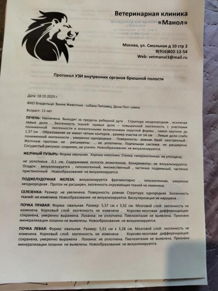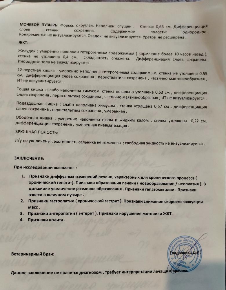 wina Опубликовано 23 часа назад Опубликовано 23 часа назад Расходы сегодня 6200: узи и внутривенные лекарства, Гептрал, метронидазол, Баралгин. Узи - верх печени нормальный, все остальное, особенно справа, хуже. Появились кисты. Желудок и кишечник воспален весь. На лекарствах- вчера ночь спокойно, поела раз индейки и два размоченный шепатик. Утром какнула поносно немного, а остальное ( желто жидко с кусочками, много) вынесла на узи. Сейчас: сварила ей суп Моро, дала пару-тройку столовых ложек и грамм 50 индейки. Ест- то она с удовольствием, но вот не задерживается. 1