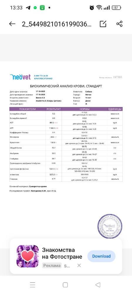 wina Опубликовано 23 часа назад Опубликовано 23 часа назад (изменено) 22 часа назад, Екатерина Кириллова сказал: Анализы крови АСТ было 106 стало 481 АЛТ было 356 стало. 1196 Щел. Фосфатаза 1260/1307 Альфа амилаза 2441/3272 Гемоглобин 122/ 101 СОЭ10/ 46 Изменено 23 часа назад пользователем wina