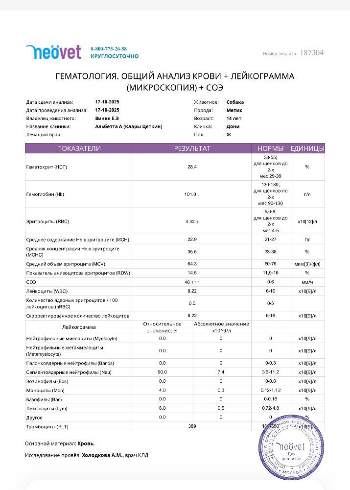 wina Опубликовано Пятница в 11:33 Опубликовано Пятница в 11:33 (изменено) У Дони очередное обострение, дня три никакая еда не усваивается. Были с утра у врача, сдали кровь, влили внутривенно гептрал и метронидазол и баралгин. Завтра узи и еще дня три ( стоит катетер) внутривенно получить вливания бы. Ест мелко нарезанную приваренную индейку с удовольствием, но внутри это не остается.. . Как сейчас после лекарств - пока не знаю. Сушку гепатик не ест, м б попозже попробую с консервами мешать. Похудела до 19,5... Расход 8220. И это нам еще когти подкоротили бесплатно. Хоть бы вылезла... бывали обострения и раньше, но не такие сильные. В теме минус 4050, и еще впереди узи и лечение. Карта сбер или Т , привязана к телефону ( см ниже). Пожалуйста,обязательно указывайте пометку "Доне". Спасибо. Спойлер +7916 тристасемнадцать тридцать пять пятьдесят один, Елена Эрнестовна я. С Пометкой "Доне! Изменено Пятница в 11:36 пользователем wina