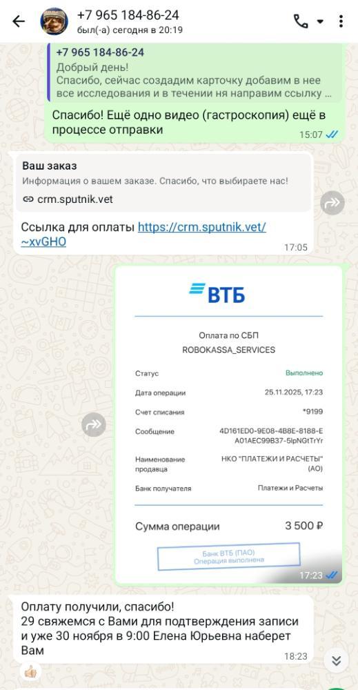 Elena_Tu Опубликовано Пятница в 17:27 Опубликовано Пятница в 17:27 Ники купили новый мешок корма и антепсин. Ну и консультацию у гастроэнтеролога тоже оплатили. Корм (подорожал на 1,5 тысячи 😳) - 10 477 руб. Антепсин - 1847 руб. Консультация гастроэнтеролога - 3500 руб. (консультация была онлайн, оплату проводила по ссылке, из чека не понятно, куда отправлены деньги, конечно. Но дополнительно прикладываю чат с клиникой, где они подтверждают получение оплаты)
