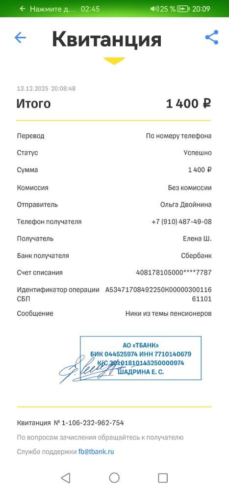 Ольга и Огонёк Опубликовано 13 декабря, 2025 Опубликовано 13 декабря, 2025 (изменено) 18200 отправляла в санаторий, 1750 вернулись. Итого санаторий получил 16.450 Изменено 13 декабря, 2025 пользователем Ольга и Огонёк