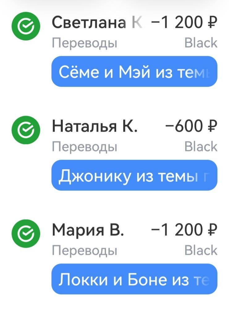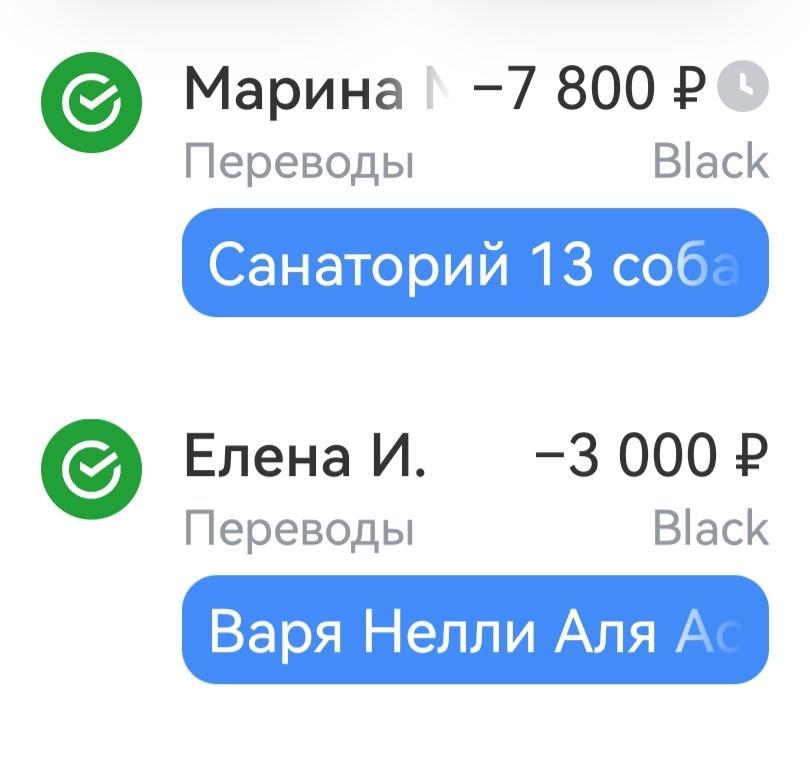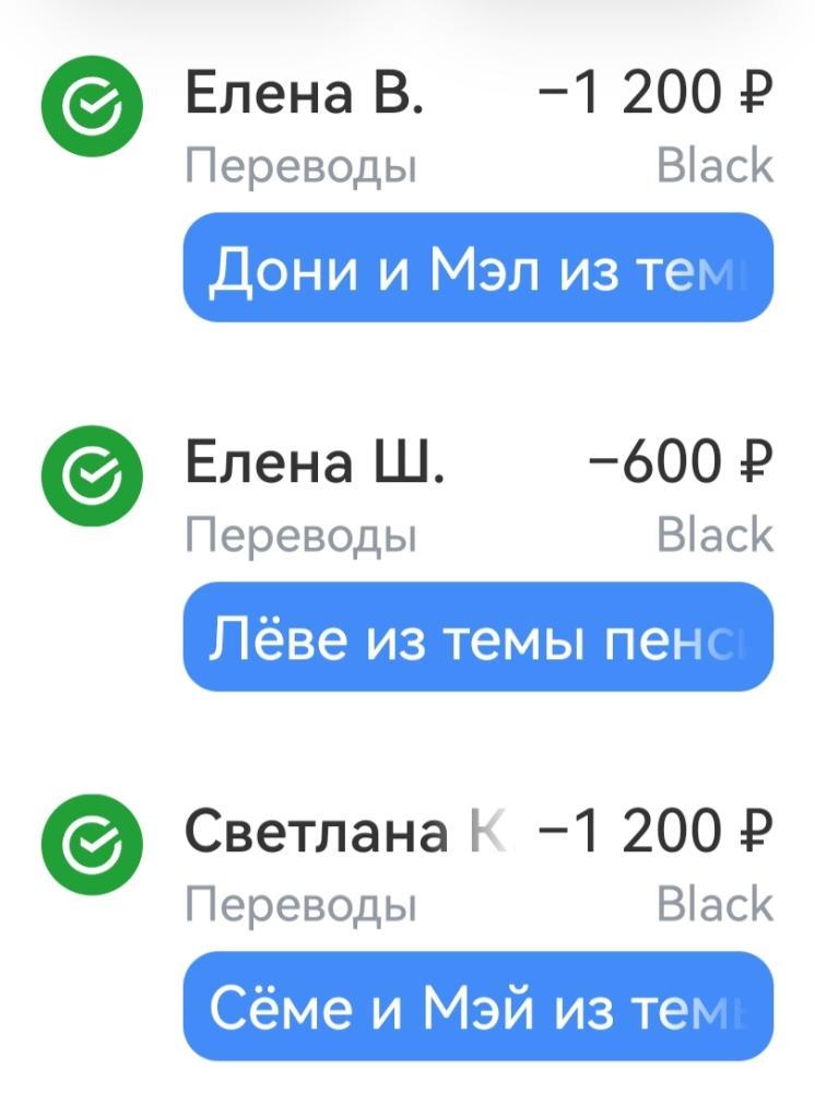 Elena_Tu Опубликовано 30 сентября Опубликовано 30 сентября 9 часов назад, Ольга и Огонёк сказал: СЕНТЯБРЬ Переводы с Т-банка 1-2 Локи и Боня, куратор Мария Радуга 2 х 600= 1.200 3 Джоник, куратор Бонита 600 4-5 Сёма и Мэй, куратор Светлана 2101 2 х 600= 1.200 6 Санни, куратор я , в конференции 600 7 Лёва, куратор Елена Tu 600 8-9 Дони и Мэл, куратор Wina 2 х 600= 1.200 10-15 (5) Варя, Нелли, Аля, Мася, Женева, 5 х 600= 3.000 куратор Шумахер 15-27 (13) Ламбик, Велес, Барни, Ася, Салли, Пухля, 13 х 600= 7.800 Дик, Фаня, Милаша, Руся, Дилан, Майкл, Тони Санаторий "Будь здоров". на карту Вячеславовны итого 16.200 остаток 480 руб Для Лео получила 600 руб. Спасибо большое! 1