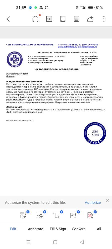 С Варей продолжаем лечение назначенным терапевтическим курсом . По цитологическому заключению результативной информации для прояснения ситуации получить не удалось , диагностической процедуры в полноценном объёме провести  не получилось по объективным причинам , забор материала для  гистологии был не возможен , а полученные мазки при цитологическом исследовании не дают , к сожалению, возможности окончательной диагностики . Рекомендованную в заключении повторную диагностическую процедуру , после консультации с лечащим врачом , мы пока проводить не будем . На данный момент тактика лечения это курс терапии антибиотиками и дополнительная поддерживающая терапия . После окончания курса терапии сдаём контрольный анализ мочи и УЗИ контроль мочевого пузыря . И затем , по результатам , корректировка дальнейших действий.С Варей продолжаем лечение назначенным терапевтическим курсом . По цитологическому заключению результативной информации для прояснения ситуации получить не удалось , диагностической процедуры в полноценном объёме провести  не получилось по объективным причинам , забор материала для  гистологии был не возможен , а полученные мазки при цитологическом исследовании не дают , к сожалению, возможности окончательной диагностики . Рекомендованную в заключении повторную диагностическую процедуру , после консультации с лечащим врачом , мы пока проводить не будем . На данный момент тактика лечения это курс терапии антибиотиками и дополнительная поддерживающая терапия . После окончания курса терапии сдаём контрольный анализ мочи и УЗИ контроль мочевого пузыря . И затем , по результатам , корректировка дальнейших действий.