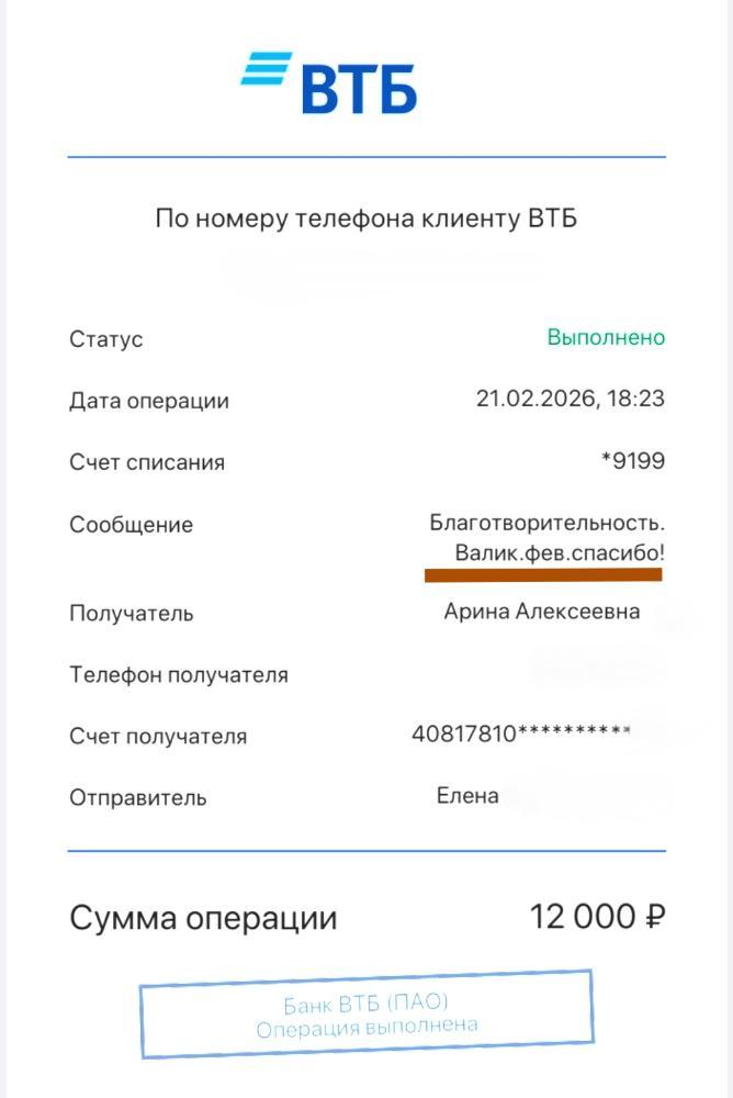 Поддержать Валико финансово можно на карты СБ или Альфа, привязаны к номеру 791О48749О8 Елена Николаевна Ш.