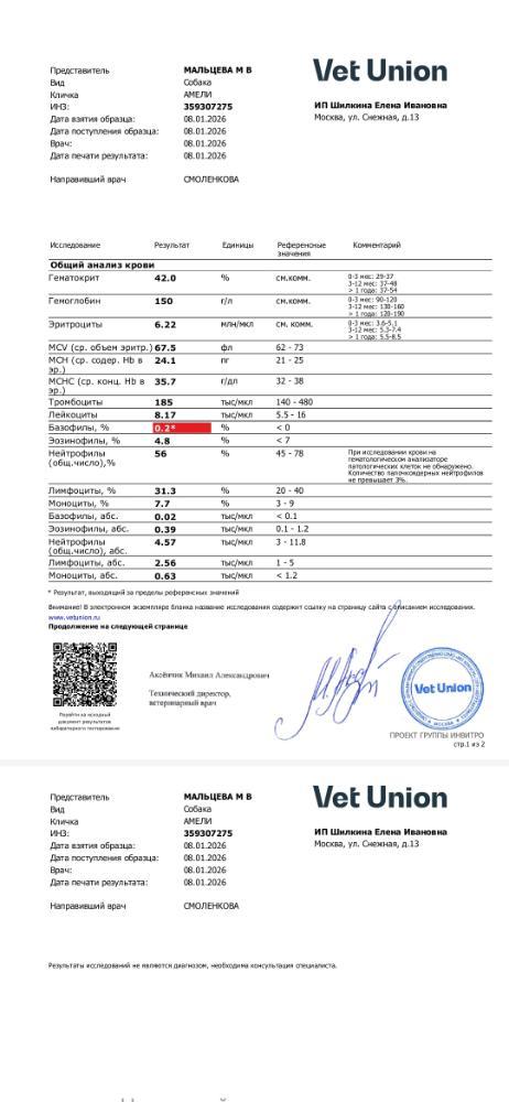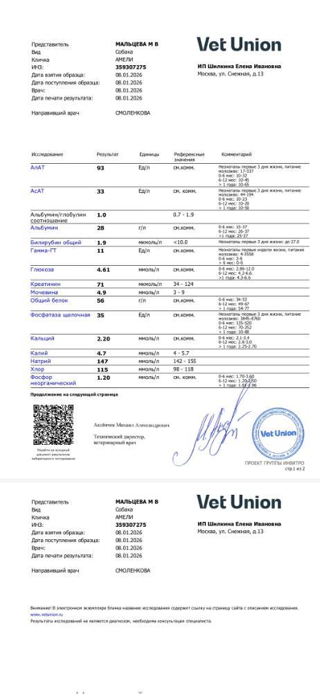 Вячеславовна Опубликовано 8 января Автор Опубликовано 8 января Добрый вечер от Амели😍 Сегодня мы посетили клинику Шилкина и сдали ока и биохимию ( давненько не проходили ТО). По глазкам всё отлично, импланты прижились хорошо!!!! Ждём результаты анализов. Финансовый отчет. Остаток: 57361р. Расходы: Приём, ока, биохимия -4300р. Зоотакси 3500р. Корм январь 12 кг -1644р. Остаток: 47917р. Благодарим за помощь и поддержку🙏💕 Видео в телеграмм канале https://t.me/labrohome 3