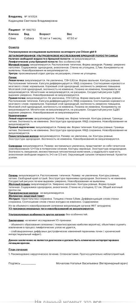Врач посмотрела анализы. Анализы хорошие, небольшие отклонения, но не критично. Удивилась, что щелочная фосфатаза в норме. Ничего не предвещало. И самочувствие было хорошее, весёлый, активный, аппетит. Только последнюю неделю видно, что плохо. Возможно это и не из за позвоночника, а от селезёнки, там болело. Мы то всё позвоночник контролируем. И начали то с невролога.