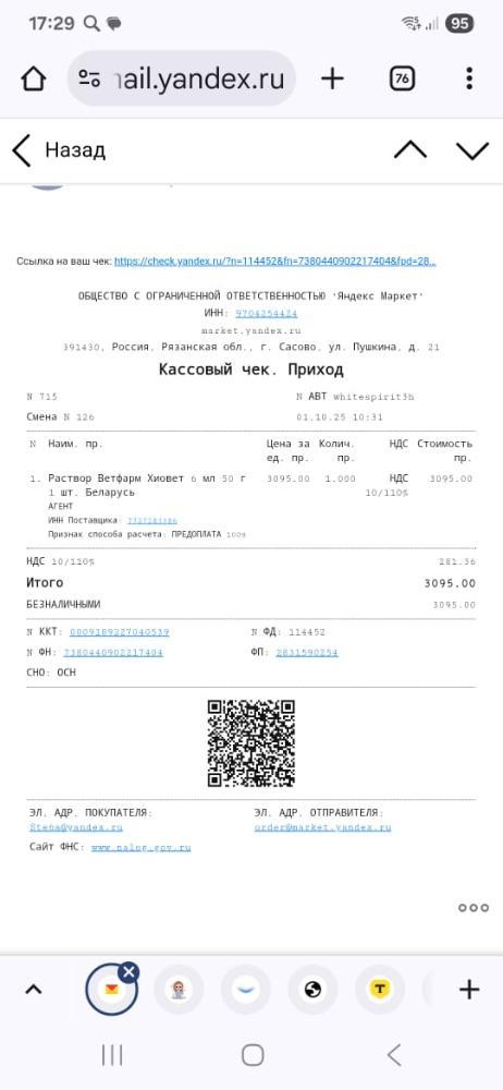Приобрели пока 1 флакон хиовета (нужно 2). Цена 3095.