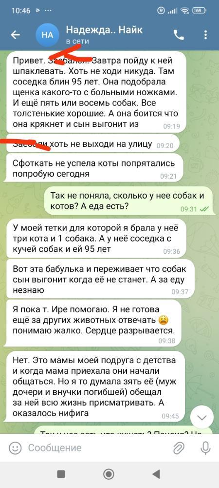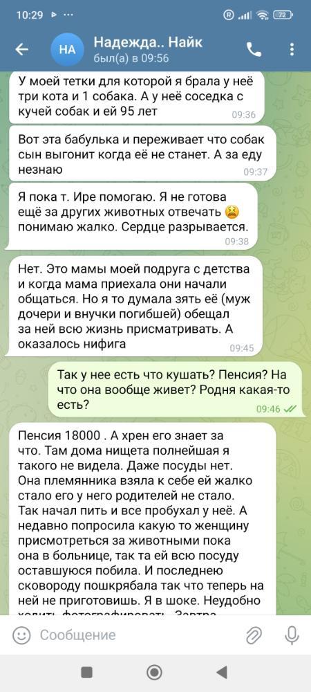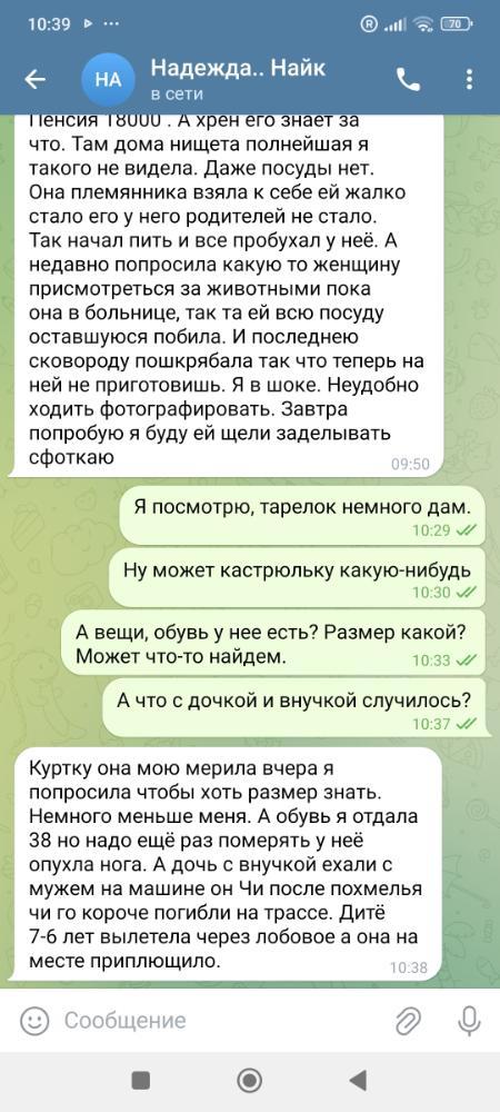 Друзья, хочу обратиться к Вам за разовой помощью. Пожилой одинокий человек столкнувшийся с бедой. Очень нужно все: постельное, одежда, еда для нее и животных. Небольшой, косметический ремонт мы сделаем своими силами, пока хоть щели нужно в доме замазать. Дело вот в чем. Есть у меня подруга, Надя, хороший отзывчивый человек, у которого 10 лет прожил выброшенный в 14 году пес эстонской гончей и живет лысая кошка с передовой. Вчера она обратилась с просьбой о помощи для знакомой, мамы подруги детства. Немного еды ей и животным вчера отвезли. Дальше переписка.