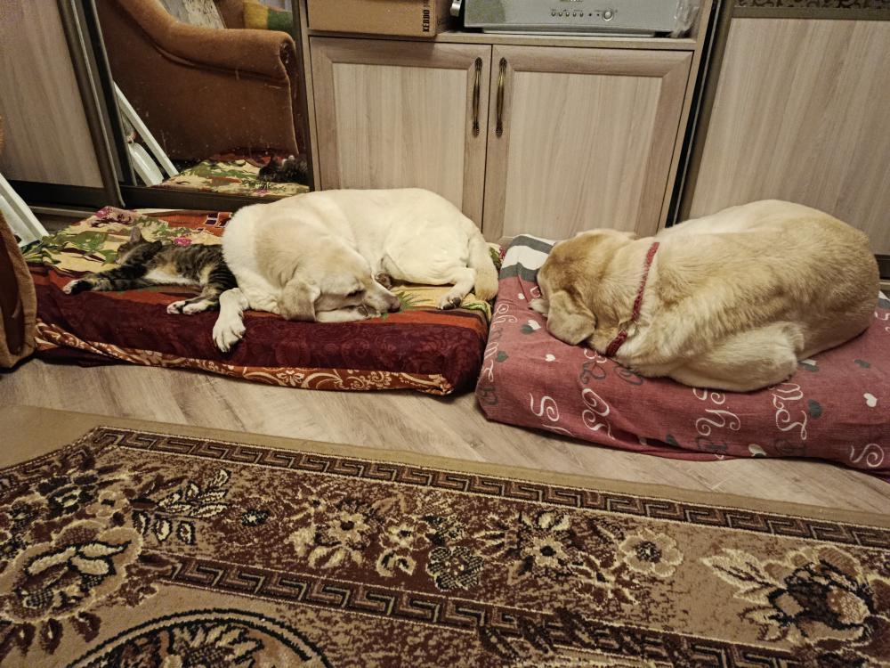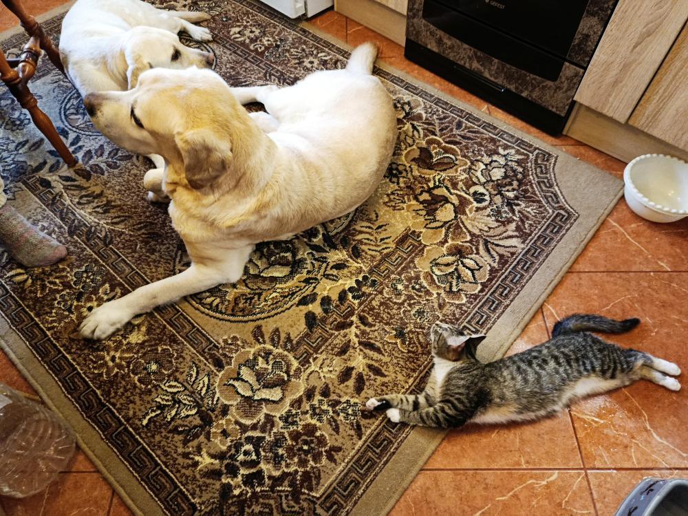 Собаки сегодня с нами на кухне расположились. И котька рядом, не захотела в комнате одна. Как же она полюбила собак. И они к ней благосклонны.