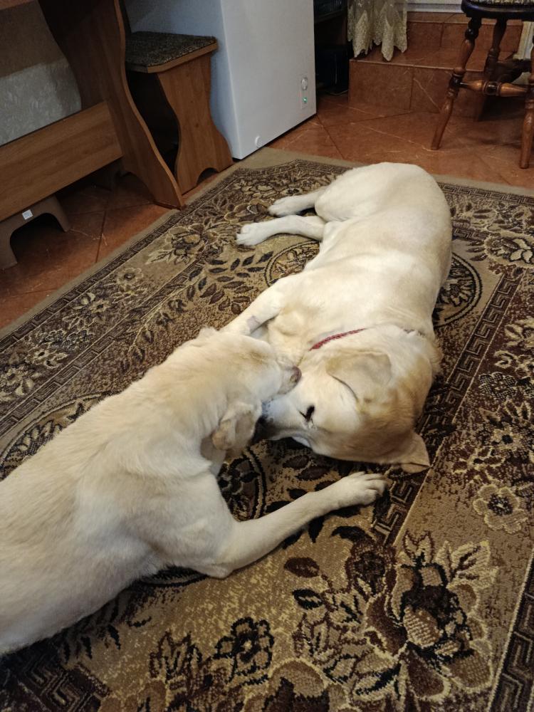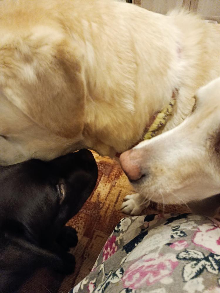 Всё хорошо, Виски не испугался совсем двух выскочивших к нему двух собак. С Мэем сразу хвостом вилять, Мэй тоже очень доброжелательно. Лина, как всегда , была недовольна. Потявкивала на него при приближении. Она всегда так. Но в целом мирно. Виски возрадовался, играться.