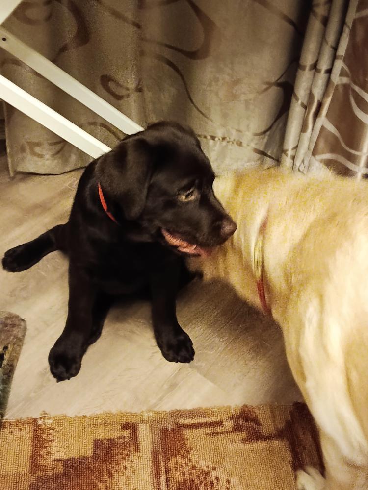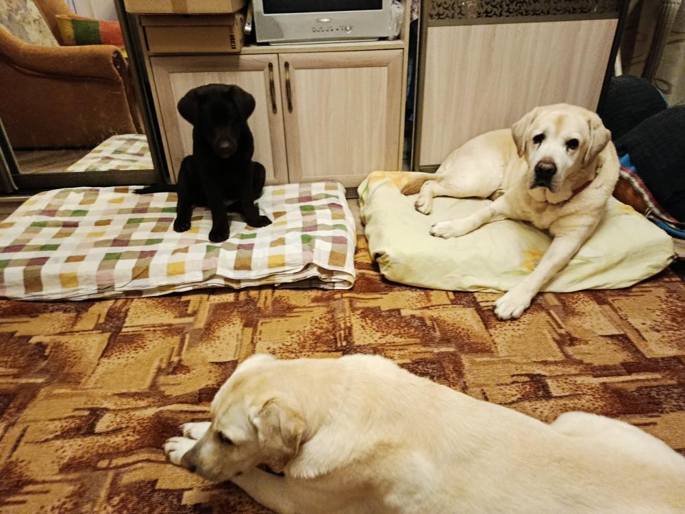 Потом лежала на клетке вся сжавшись, уши прижала, следила. Виски лаял на неё. Тоже интересовался. Привыкнут. Время.