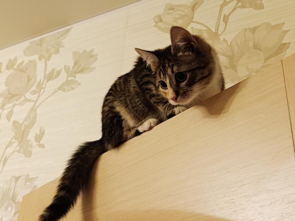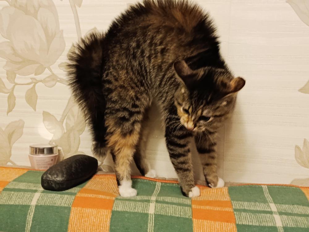 Вот так. Шипела, рычала, но с высоты, со спинки дивана. А сначала совсем спряталась, нашла ее на балконе.