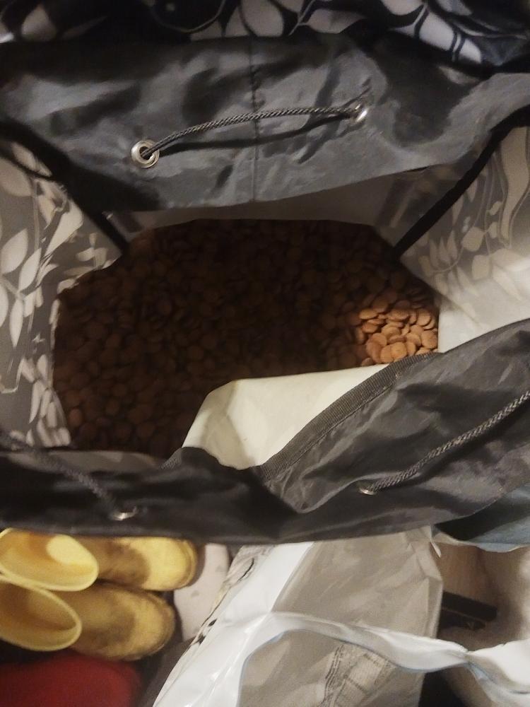 Мешок оказался большой, не входил в сумку. Как ни запихивала. Поэтому пришлось его вскрыть прямо на пункте и большую часть высыпаться в сумку, а уже сверху положить сам мешок с небольшими остатками корма. Только что переспала все обратно. Завтра начну уже прдмешивать и давать новый корм Максу. Кирилл, ещё раз огромное спасибо за такой подарок!!!