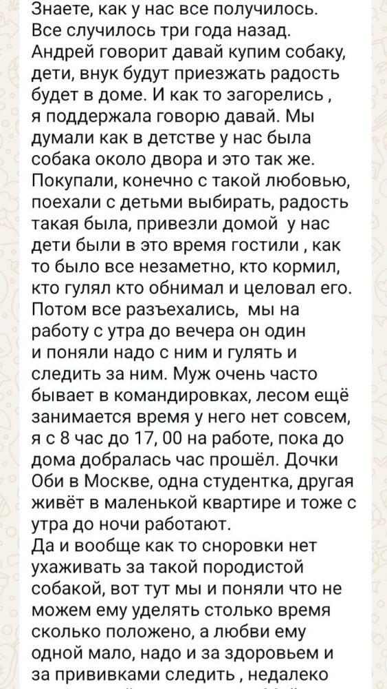 Варвара Чукова Опубликовано 7 сентября Автор Опубликовано 7 сентября Давненько не была тут😜 А рассказать есть о чем. Начнем по порядку. Как я стала "случайной крестной" одного шоко-боя😜 Пару недель назад получаю от подруги такое сообщение. Выпускник питомника Nicol' Poli (откуда мои ребята) ищет дом. Меня просят разместить по местным группам это объявление. Я сказала, что вводных данных слишком мало и нужно получить более полную информацию по животному. Связалась с контактным лицом, указанным в сообщении. Это оказались первые владельцы этой собаки, которые 3 года назад его и купили. Потом они отдали его соседке Майе в своей деревне, где он и жил. Женщина эта заболела (грыжи на позвоночнике) и ухаживать за животными стало некому. Из близких -только мама. Первые владельцы взять его не могут, им некогда заниматься собакой. Вообщем, гулять с ним они согласились, кормит мать этой женщины Майи и они (первые владельцы) наконец-то додумались сообщить заводчику,что собака больше не нужна. Так мы и узнали, что "николь полиейц" в беде.