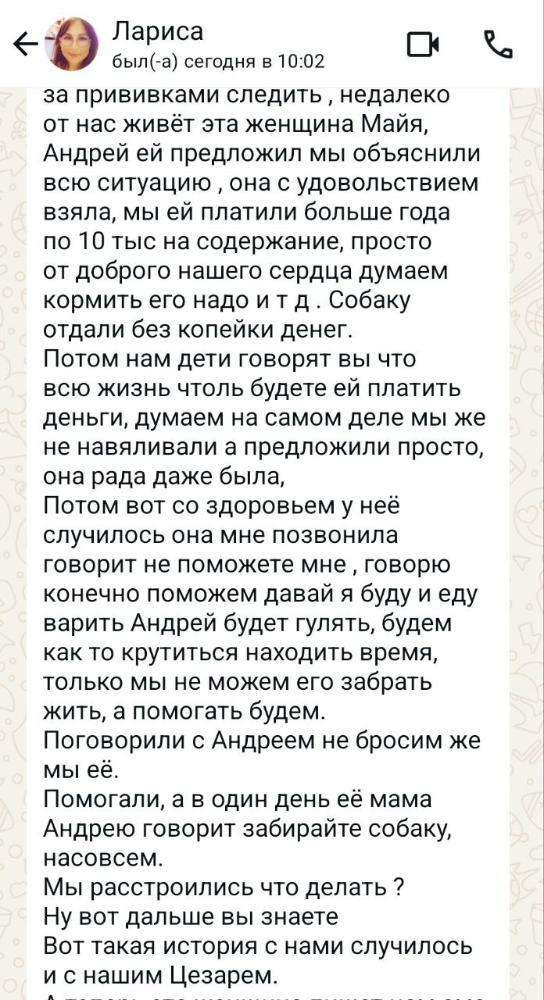 Варвара Чукова Опубликовано 7 сентября Автор Опубликовано 7 сентября А эту историю его жизни и как он оказался у другого человека мне прислала женщина,которая и покупала его. Правда, надо сказать им спасибо, что все расходы, связанные с содержанием Цезаря у нас они покрывали по первому обращению и были всегда на связи (корм, вакцинация, обработка от блох и клещей, ошейник и поводок). 2
