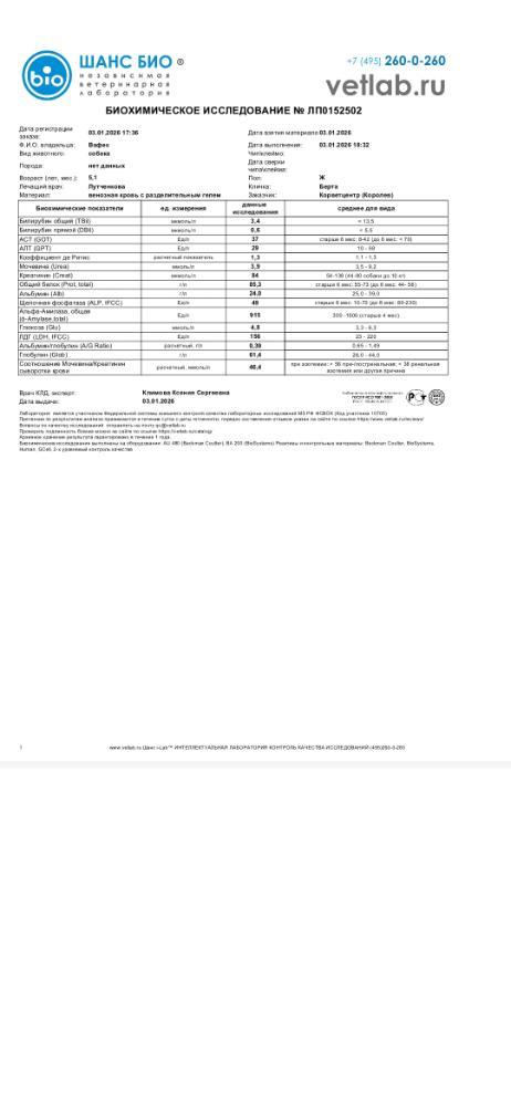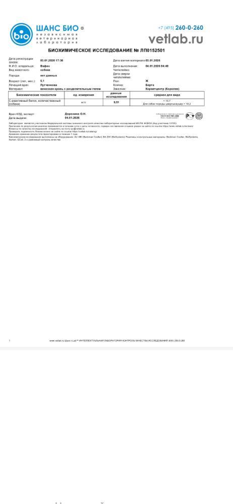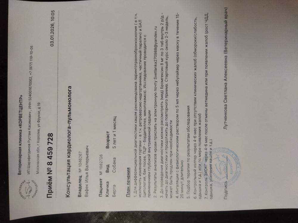 Вячеславовна Опубликовано 3 января Автор Опубликовано 3 января Добрый вечер!!! С'ездили сегодня с Бертой к кардиологу и пульманологу. По сердцу: расшифровка холтера неплохая, отменили ветмедин, через полгода пройти кардио обследование. Сдали ОКА и биохимию. Сделали рентген. ( результаты на почту). Тот кашель, который есть сейчас, не сердечный. Для диагностики кашля рекомендована ларинготрахеобронхоскопия(исключить изменение гортани, в тч ретро версию надгортанника, частичный паралич) и БАЛ. Всё это удовольствие на вес Берты стоит 30000р.🤔🧐🤔🧐 Подбор терапии по результатам обследования. Сейчас бромгексин 8 мг и ингаляции с физ раствором. Финансовый отчёт. Остаток: 15590р. Расходы: Пульманологу, рентген, анализы -8853р. Зоотакси -1330р. Остаток: 5407р. Помощь Берте очень актуальна!!! Мой номер 89261818009 привязан к карте СБ на имя Марина Вячеславовна М. с пометкой " Берта". 1