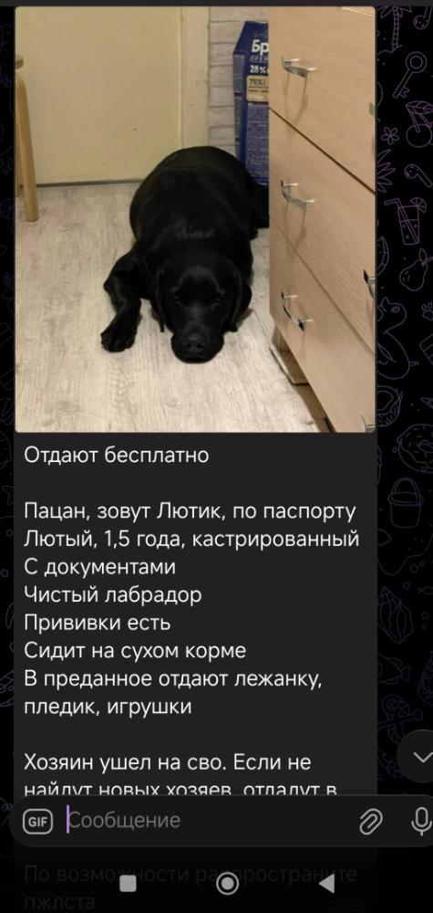 Катерина Mark Опубликовано 14 часов назад Автор Опубликовано 14 часов назад Был у нас в праздники вот такой пост. О пристройстве. Без номера телефона Потом кто то кто размещал пост написал - собака пристроена Это было 8 января 8 же января на улице появился этот лабр. Совпадение? Не верю в такие совпадения. Учитывая что по Лютику писали в два приюта. Просили принять. Получили отказ. Так как в приютах нет тёплых условий. Таких собак из семей тем более не принимают. В общем. Ещё один молодой лабр до года У нас дисплазия. Нужно ехать к хирургу. Заваливает зад 🥺 И он крипторх Моим парням нужна помощь форума Все на платной передержке