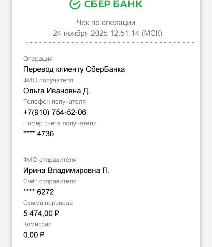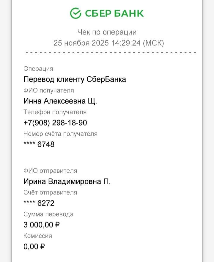 Ирина Счастливая. Опубликовано 24 ноября Опубликовано 24 ноября Всем доброе🫶 Отчет: Ост:Минус'5474р. Приход: Оксана А-600р. Виктория-500р. Ольга К(от Элги и Рич)-2500р. Галина К-700р. Мария Л-200р.(без пометки) Наталья Ч-500р. Ост: минус-474р.❇️ Реквизиты: карта СБ привязана к номеру: 8 964 517 25 21 на Ирина П С пометкой- Ермак❤️ Огромное всем спасибо❤️🩹 Друзья, помогите нам закрыть минус🙏 И собрать хотя бы на несколько дней передержки 🙏