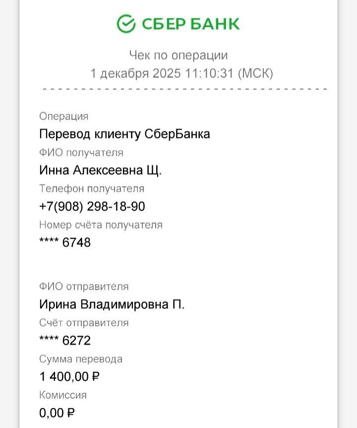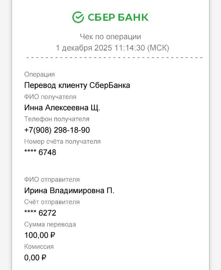 Ирина Счастливая. Опубликовано Понедельник в 08:20 Опубликовано Понедельник в 08:20 Всем доброе🫶 Отчет: Ост:26р. Приход: Мария С-500р. Виктория-1000р. Расход:( оплата передержки 3дня ×500=1500р.(с 1.12. по 3.12. включительно). Ост: 126р. Благодарим за поддержку❤️🩹❤️ Реквизиты: карта СБ привязана к номеру: 8 964 517 25 21 на Ирина П С пометкой -Ермак❤️