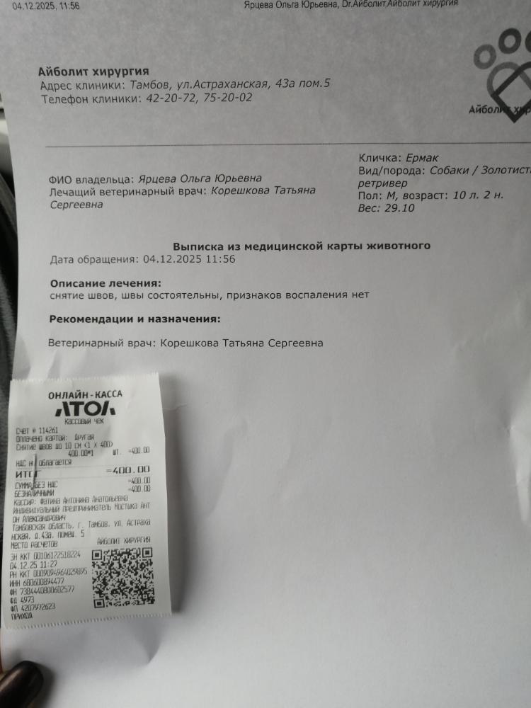 Ольга и Огонёк Опубликовано Четверг в 09:07 Опубликовано Четверг в 09:07 (изменено) Ермака свозила в клинику. Все швы сняли. Всё хорошо. Чек я оплатила. Глаза стали получше, но нужно продолжить капать капли. Изменено Четверг в 09:31 пользователем Ольга и Огонёк 8