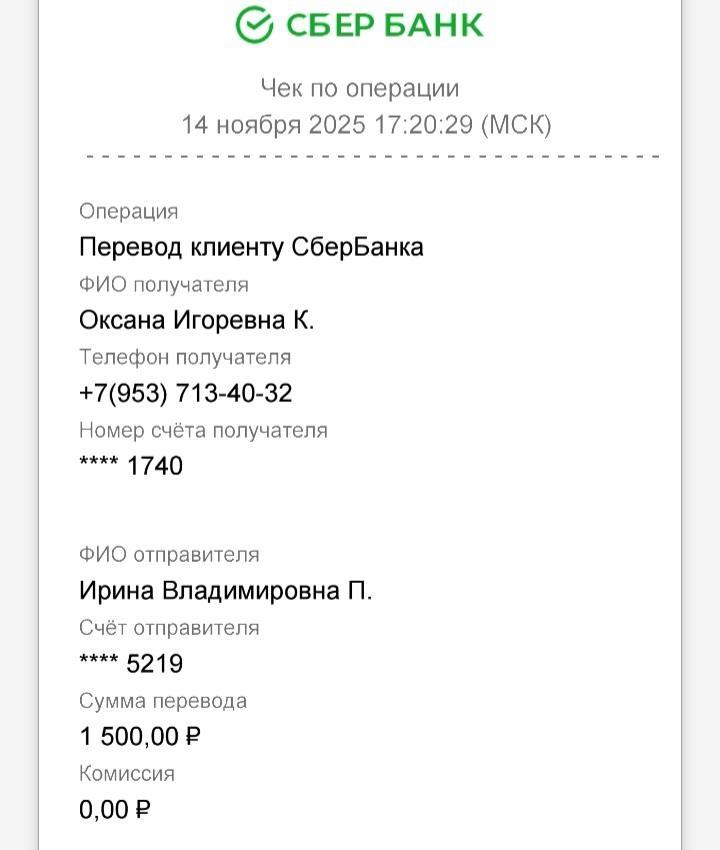Ирина Счастливая. Опубликовано Пятница в 11:15 Опубликовано Пятница в 11:15 (изменено) Отчет: Приход: Елена Б(от Несси)-1000р. Ирина К-1000р. Мария С-500р. Елена Д-1000р. Вячеслав Л-1000р. Людмила Б-3000р. Виктория -1500р. Елена В-500р. Алексей Х-3000р. Оксана А-500р. Елена Б(от Несси)-500р. Елена Б-2000р. Ольга Н-5000р. Виктория В-1000р. Лариса П-2000р. Расход: Зоотакси за 13.11-3000р. Сегодня: (зоотакси, обследования. Милпразон)-12670р. Ост: 7830р. Реквизиты: карта СБ привязана к номеру: 8 964 517 25 21 на Ирина П. С пометкой- Ермак❤️ Огромное всем спасибо❤️🩹❤️ Изменено Пятница в 11:35 пользователем Ирина Счастливая.