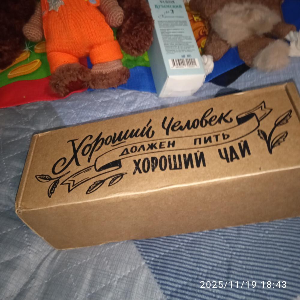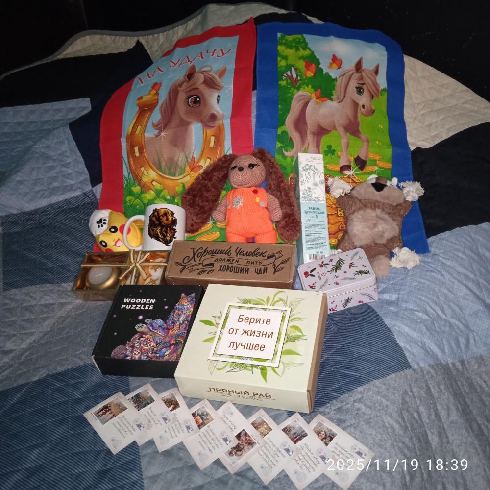 Ольга и Арни Опубликовано 4 часа назад Опубликовано 4 часа назад (изменено) Вместе с первым снегом пришло и ожидание праздника, подарок от замечательного Друга! @Oksana Rogkova, Ксюша, спасибо тебе за такой трогательный и замечательный подарок, за то, что направила мое подкисшее настроение КУДАНАДА! Красивые полотенчики с символом года; Разный вкусный чай (да еще с каким названием! мммм...); Кружка! Там сказано ВСЕ!; Деревянный пазл (а как пахнет! - обожженным деревом!); А какие носочки в коробочке!; Крымский бальзам для крепких нервов - очень нужная вещь. Очень; Игрушки для хвостиков - тапок и шуршалка поедут к собачкам дочки, а вот того, что в оранжевом комбинезоне никому не отдам!; И праздничные свечки, и праздничные карточки с добрыми пожеланиями - прелесть! Ксюша, спасибо тебе за правильный предпраздничный пендель! С наступающим! Изменено 3 часа назад пользователем Ольга и Арни 8