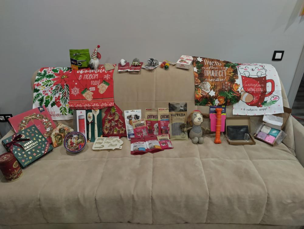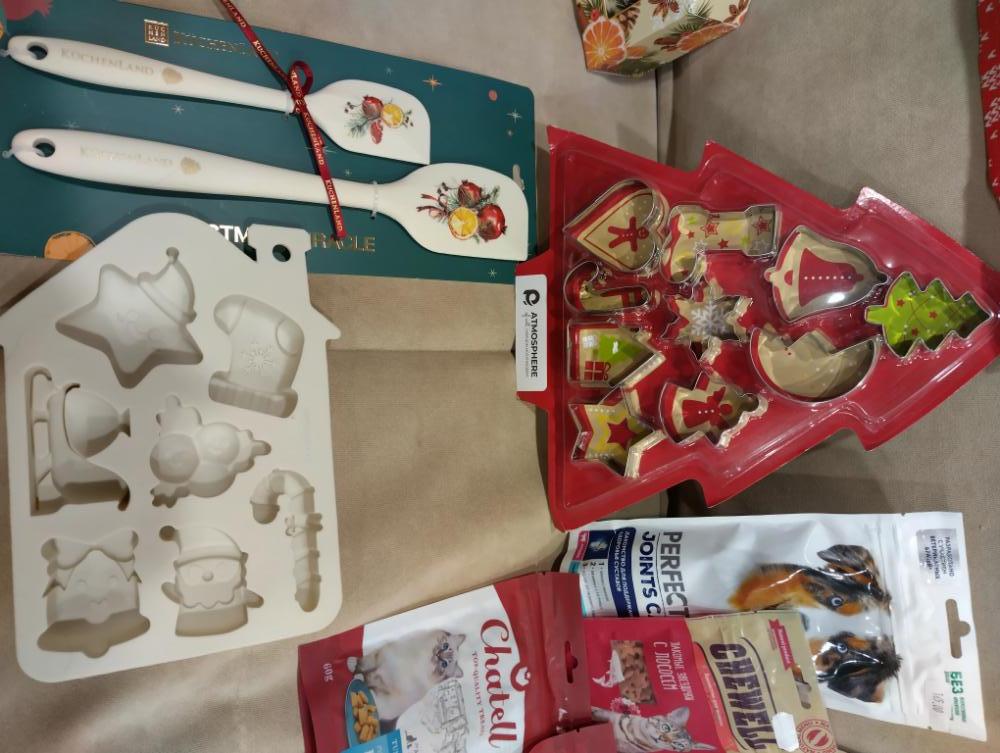 Катя и Гусь Опубликовано Среда в 16:44 Опубликовано Среда в 16:44 И так..пришла наша посылочка из Москвы! Подарок конечно потрясающий очень новогодний! Мой любимый kuchenland тут как тут: лопаточки, силиконовая форма новогодняя, и чудесный термос! Для кухни классные новогодние полотенца, формочки для печенек, мои любимые печенья в жестяной коробке, чай два вида, конфеточки🥰 Новогодний гномик для дома😍 нам с Гусем сумочка для занятий 🔥 Паше брелок "охота важнее добычи" и обложка для охотничьих документов с легавой Котам Ярлу и Яше игрушки: мячики, орущая мышь, енот и ёжик!! Куча вкусняшек котам и собакам! Гусю мягкая игрушка собачка, Нике палка-хрустяшка. Гусь с этой собачкой носится, утащил в лежанку🤣 Красивые бомбочки для ванны 🤫 Дедушка спасибо тебе огромное за подарок, мы в восторге! Но мы не поняли где подсказки 🤣 Московских дедов очень много, поэтому мы запутались)) Письма нет, мандаринка я так понимаю не участвует, так что аромадиффузор как подсказка отметается) собак с именем Енот Ёжик или Гномик я не знаю 😅хотя в теме АДМ один дед писал что гномик помощник подрос, но мне кажется, что это я уже непонятно за что цепляюсь🤣 ну и ещё пункт отправки на бульваре ракетный, может надо на это ориентироваться 🙈 13