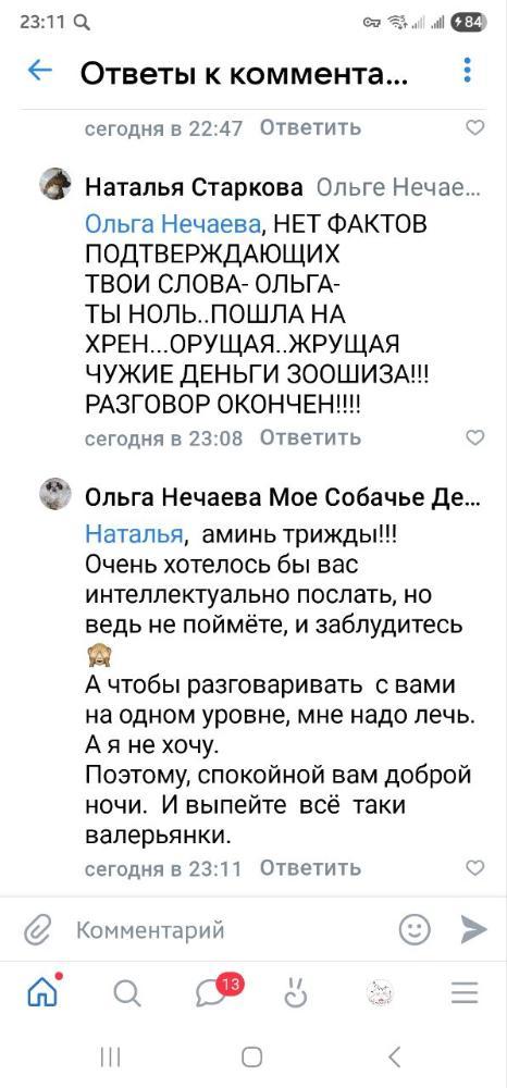 Нечаева и Ко Опубликовано Пятница в 07:51 Автор Опубликовано Пятница в 07:51 Друзья. Читаю посты в темах, и прям... некомильфо от слова " совсем". Такими темпами мы далеко не уедем. А можем и вообще остаться на перроне. Я, конечно , мало на что и на кого могу повлиять , но высказаться - выскажусь. Хотя в первом своём посте уже это сделала. Попробую ещё раз. Всё смешалось в доме Облонских. Кони, люди... Обвинения, оскорбления, наезды, упрёки, подозрения ... И уже и угрозы пошли в ход🙈 Если честно , у меня тоже много вопросов по разным " вопросам". Сори за тафталогию. Но. Если уж совсем честно - нет ни сил, ни ресурсов , ни времени копаться и разбираться. У нас у всех, помимо наших собак - Жизнь - болезни, работа, дети, танцы, в конце концов 😀💃. У меня - точно. Возможно , настало время разобраться и что то поменять, или вообще всё поменять. Скажу от себя. Вот, мне думается - темы Марины Вячеславовны можно объединить в общий раздел Лабродома. Собак много. Тем много. Денег к сбору много. Как я уже говорила - " моим" собакам на форуме в последнее время практически не помогают. И на это, безусловно , есть причины. Удивилась , что на Снежку собрали более 60000 (низкий поклон ). Но это, думаю, потому, что тема слишком резонансная была. К огромному сожалению , форум давно поделился на " ваших" и " наших". Следом за этим , и собаки поделились на эти же категории. Хорошо это или плохо - не берусь судить. Печально ? Да - факт. Раньше было по другому. Как говорил Жванецкий " Раньше всё было".😀 Мы реально были вместе и были силой. Ныне " Все подружки по парам в тишине разбрелися".. И это совсем грустно. И самое ужасное , что в очередных спорах , в мгновение переходящих в скандал, начинаются переходы на личности. И уже никакой истины тут родиться не может. Мало того, остаётся неприятный осадок ( в лучшем случае ). В худшем - взрывы мозга до скачков давления, и прочих неприятных для здоровья, вещей. И кому от этого хорошо? 😥 Может, и правда, настало время перемен. Но и перемены эти можно делать иначе. Нет? История со Снежкой получила продолжение на страницах ВК. Почти на 400 комментариев. Может, и больше уже. Господи, до какой низости доходят люди исключительно" из добрых побуждений"🙈 Так и хотелось написать " Господа, вы звери....Господа ". Какие оскорбления, какие жуткие базар - вокзальные наезды и обвинения. А суть в том, что я завезла больную собаку из недружественной страны Грузии. Раскатали меня и клинику , и врачей катком. Выложу небольшие скрины - мааааленькую часть этого большого Г...на. И. Но не для обсуждений. А лишь для того, что мы здесь , в своих разборках и претензиях , можем скатиться и до такого. И в каких то ситуациях - уже. В самом страшном сне я не могла представить , что когда нибудь , здесь, на форуме , меня обвинят в сговоре с врачами, фразой " рука руку моет", расскажут о том, что спасаю собак ради восторженных откликов и рукоплесканий... Как ? Как это стало возможным здесь, у нас, на форуме , который славится порядочностью и культурой общения? И всё таки - баны - вещь хорошая. И очень нужная. Прям, реально отрезвляет людей. Давайте как то более уважительно и конструктивненько. Как я говорю своим клиентам, или тем " ручкам", кто хочет взять собаку, и кто спрашивает про " охрану" : Нучить собаку рвать ж..пу - не сложно. Вы научите её не делать этого, или , хотя бы, отзываться в секунду. Скандалить , " ТЫкать", бросаться обид