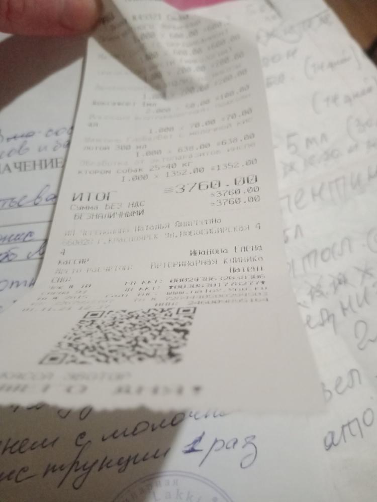 Ольга и Огонёк Опубликовано 10 часов назад Опубликовано 10 часов назад 14 минут назад, CanisLupusVita сказал: Странно как то.... а где фото собаки?? Чеки странные очень. И почему в анализах другой номер? Мошенники? Первое фото 23 год, второе размазано