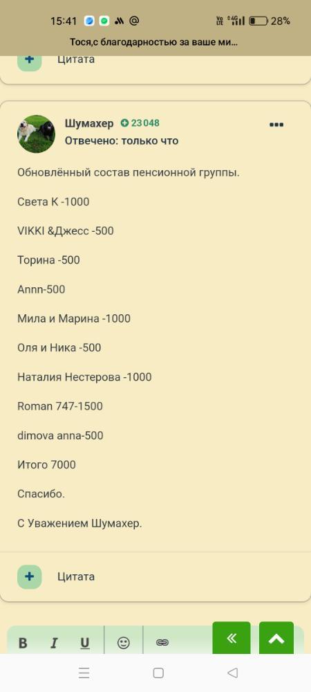 Шумахер Опубликовано вчера в 16:54 Опубликовано вчера в 16:54 (изменено) Света К -1000 VIKKI& Джесс -500 Торина -500 Аnnn-500 Мила и Марина -1000 Оля и Ника -500 Наталия Нестерова -1000 dimova anna -500 devinette -500 Roman 747 -1500 Оxigi -500 Итого 8000 Спасибо большое за поддержку. С Уважением Шумахер. Изменено вчера в 17:52 пользователем Шумахер 1