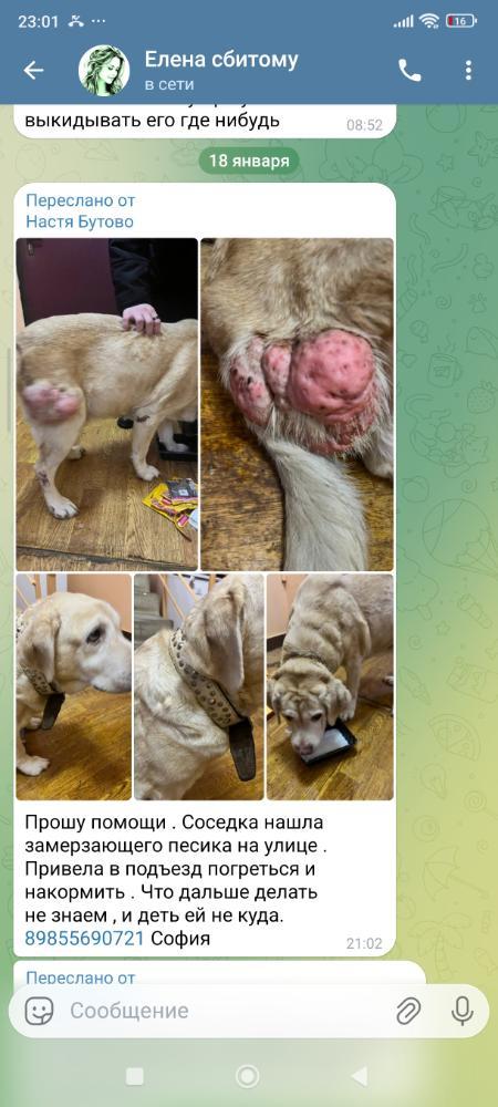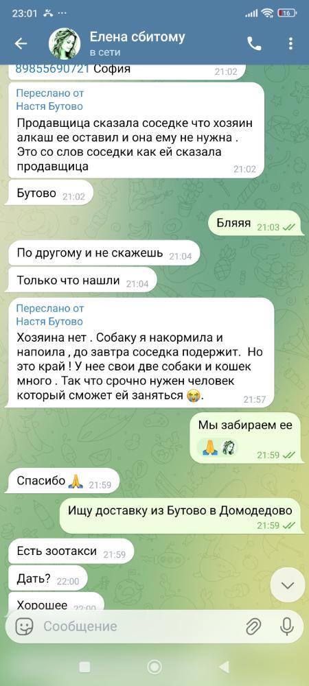 taf82 Опубликовано 12 часов назад Опубликовано 12 часов назад (изменено) Всем привет это конечно, не Грузия, Турция, Абхазия, Краснодар, Ростов и Якутия, а всего лишь наша любимая столица Москва, в вернее ее заМкадный район Южное Бутово. Но и как оказалось в Москве не перестали выбрасывать собак.давно меня не было в разделе с потеряшками и отказникам, как-то все справлялась сама. Потихоньку брала на кураторство к себе на передержку делала фоточки с помощью Кати Кустиковой, размещала в пиар и пристраивала. Но тут история не так проста и собачка возрастная и сложная боюсь, что без помощи наших форумчан мне её не потянуть ни в физическом, ни в моральном ни в материальном плане Вот такие сообщения мне сегодня вечером прилетели в телегу и я не смогла пройти мимо. Скрины прилагаю. В данный момент все на форуме знают, что у меня дома щенки и рисковать своим помётом я не готова поэтому девочка поедет на передержку к моему ветеринарному врачу Алиевой Гульнаре, многие на форуме у нее лечатся и знают Гулю в живую так, же как и меня. На форуме запрещено объявлять сбор в новых темах поэтому я не открываю сбор и не прошу денег, а прошу помочь мне кормом (с удовольствием приму в дар мешочек) обработку, глистагонку. Все можно прислать мне Яндекс доставкой. Так же если кто-то хочет и готов то девочке нужно в первую очередь сдать биопсию гадости которая у нее на бедре ( вы можете лично свозить собаку в клинику и оплатить биопсию) я буду вам всем очень благодарна за посильную помощь. Давайте ребята всё-таки вернёмся к нашему породному Московскому волонтерству. Когда мы помогаем собакам попавшим в беду в нашем регионе. Изменено 12 часов назад пользователем taf82 6