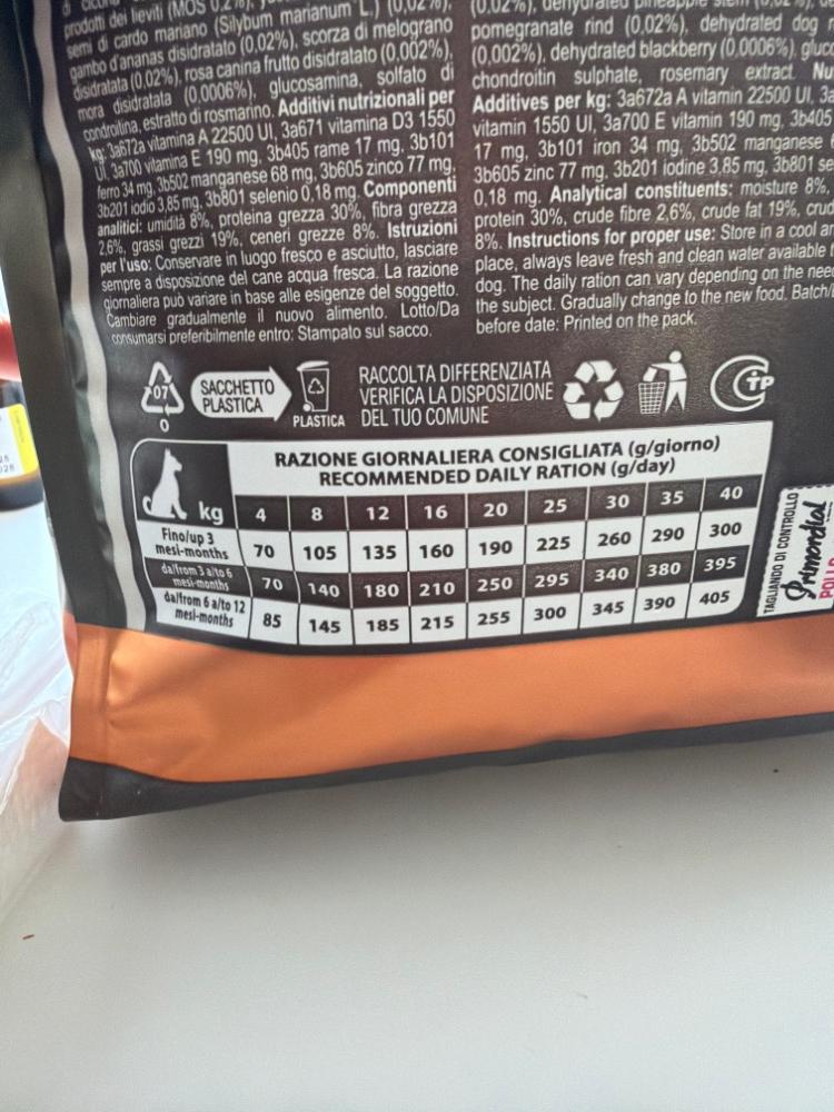 MAK1212 Опубликовано 3 часа назад Опубликовано 3 часа назад Всем привет! Перевожу щенка с Royal Canin (по рекомендации заводчика) на PRIMORDIAL. И вот ведь вопрос, я категорически не понимаю дозировку. На упаковке нет обозначения для взрослой ли собаки указана граммовка или для щенка на текущий момент. С одной стороны новый корм по качеству более мясосодержащий, чем канин. С другой стороны — уж подозрительно малой кажется граммовка. Подскажите, пожалуйста, как правильно посчитать? Собачке сейчас 3,5 мес, 11 кг, по таблице должна давать ок. 170 гр, но если брать верхнюю строку как вес собаки взрослой, то это уже ок. 260 гр. Я блин устроила собаке голодовку или все ок? 😵💫😵💫😵💫